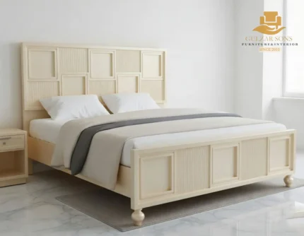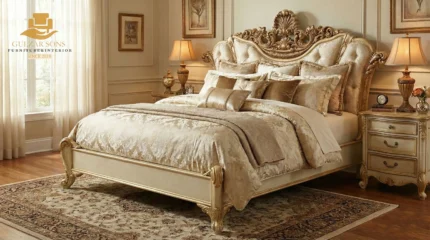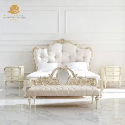 Experience the ultimate in regal slumber with the New Latest Furniture Designs 2026. This Handcrafted Luxury Royal Gold Carved Round Tufted Bed Set is a definitive example of High Quality Chinioti Furniture 2026, meticulously engineered for elite clients who demand the Best Royal Furniture in Chiniot 2026. Featuring a monumental headboard with integrated architectural columns and a unique curved “Round-Style” footboard, this set establishes Gulzar Sons as a premier luxury brand 2026.