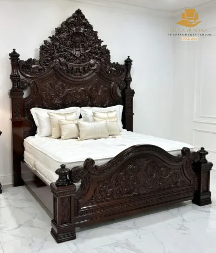Bring the timeless elegance of a palace to your home with the New Latest Furniture Designs 2026. This Heritage Royal Victorian Carved Red Velvet Bed Set is an extraordinary example of High Quality Chinioti Furniture 2026, meticulously handcrafted for elite clients seeking the Best Royal Furniture in Chiniot 2026. Featuring a high-profile “Crown” headboard with deep-relief Victorian scrollwork and premium ruby-red tufted velvet, this set establishes Gulzar Sons as a premier luxury brand 2026.
