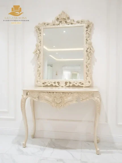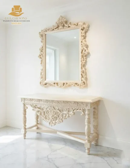 Redefine your home’s grandeur with our New Latest Furniture Designs 2026. This Antique French Baroque Console is a masterpiece of High Quality Chinioti Furniture 2026, designed for those who seek the Best Royal Furniture in Chiniot 2026. Featuring a breathtakingly ornate apron with hand-carved floral scrolls and a centerpiece heart-motif, this console is finished in premium antique white with hand-applied gold leafing, establishing Gulzar Sons as a premier luxury brand 2026.