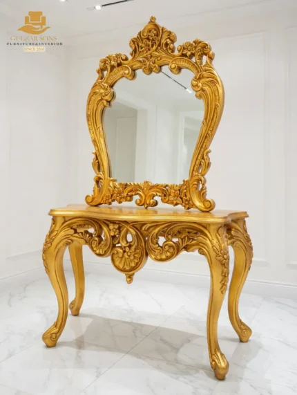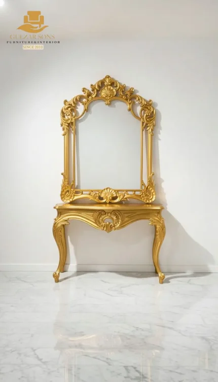 Make a grand first impression with our New Latest Furniture Designs 2026. This Gilded Neo-Classical Console Set is a signature piece of High Quality Chinioti Furniture 2026, designed for homeowners who appreciate the Best Royal Furniture in Chiniot 2026. Featuring a sleek half-moon console with slender fluted legs and a magnificent woven-pattern round mirror, this set is finished in a radiant antique gold that solidifies our status as a premier luxury brand 2026.