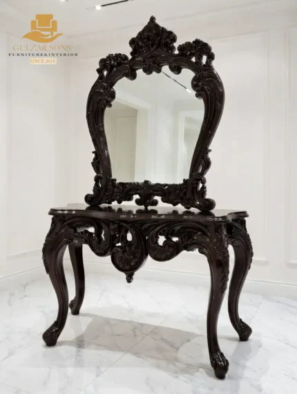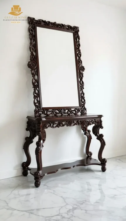 Bring timeless grace to your personal sanctuary with our New Latest Furniture Designs 2026. This Victorian-Style Wood Console is a signature example of High Quality Chinioti Furniture 2026, perfectly suited for those who demand the Best Royal Furniture in Chiniot 2026. Featuring a grand oval tilting mirror, multiple utility drawers with antique brass pulls, and elegant tapered legs, this piece functions both as a sophisticated hallway console and a luxurious bedroom dressing station.