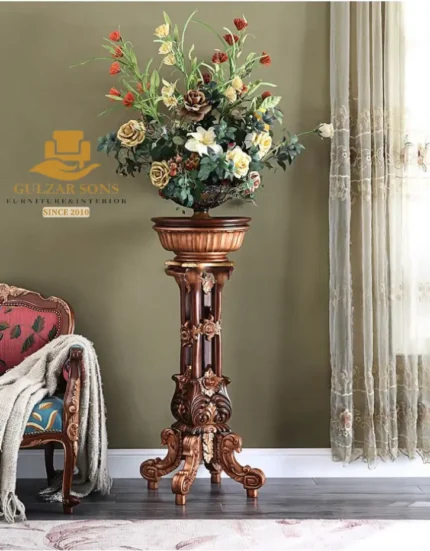 Command attention in your foyer or formal gallery with a signature statement from the New Latest Furniture Designs 2026. This Carved Wood Plant Stand (Code: N00096) is an extraordinary display of High Quality Chinioti Furniture 2026, featuring a deep-relief pillar design and a rich, multi-tonal finish. As a Top Quality Furniture Brand in Chiniot 2026, Gulzar Sons has combined classical Oriental silhouettes with traditional Chinioti craftsmanship to create the ultimate "Pedestal of Power."