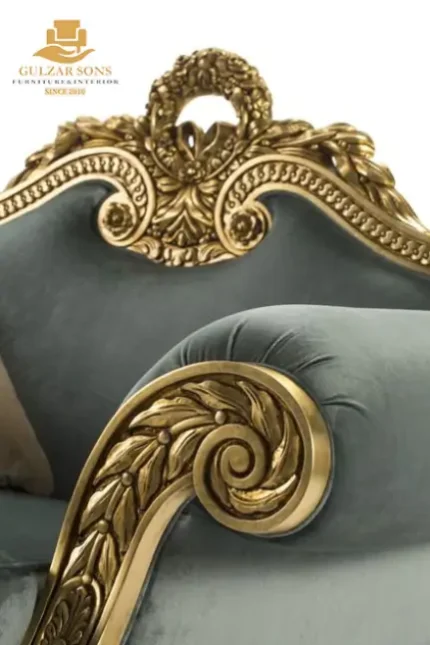 Redefine your drawing room with the understated majesty of the New Latest Furniture Designs 2026. This Classical Sage Carved Sofa is a definitive masterpiece of High Quality Chinioti Furniture 2026, handcrafted for those who seek the Best Royal Furniture in Chiniot 2026. Featuring a graceful "Crescent" silhouette with a signature gold-carved laurel crown and elegant tapered legs, this piece establishes Gulzar Sons as a premier luxury brand 2026.