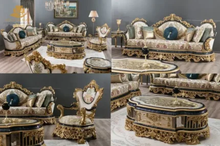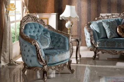 Command your drawing room with the unmatched brilliance of the New Latest Furniture Designs 2026. This Majestic Blue Gold Sofa Set is a definitive masterpiece of High Quality Chinioti Furniture 2026, handcrafted for those who seek the Best Royal Furniture in Chiniot 2026. Featuring a high-profile "Sovereign" silhouette with deep-relief floral carvings and radiant 24K gold-leafing, this set establishes Gulzar Sons as a premier luxury brand 2026.
