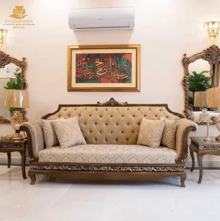 Elevate your living space with the New Latest Furniture Designs 2026. This Hand-Carved Royal Tufted Sofa Set is a premium showcase of High Quality Chinioti Furniture 2026, meticulously engineered for elite homes that value the Best Royal Furniture in Chiniot 2026. Featuring a distinctive "Camel-Back" silhouette with deep-diamond tufting and a master-carved floral border, this set establishes Gulzar Sons as a premier luxury brand 2026.