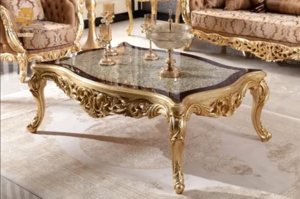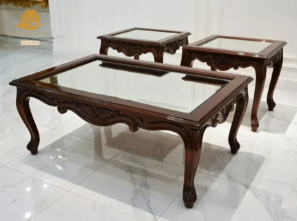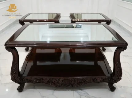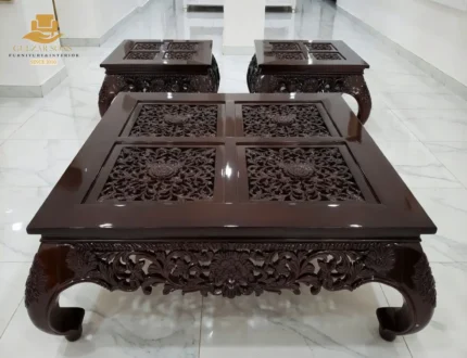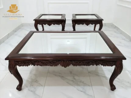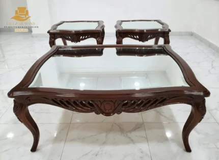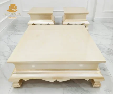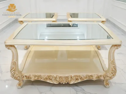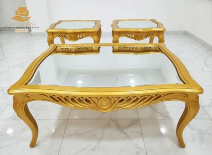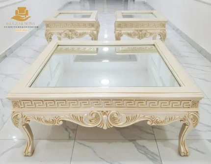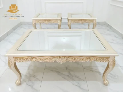 Elevate your living space with the sheer elegance of French imperial design through this center table set from the New Latest Furniture Designs 2026. This set is a masterclass in High Quality Chinioti Furniture 2026, featuring a expansive rectangular coffee table accompanied by matching side tables, all encrusted with high-relief scrollwork and traditional floral flourishes. As a Top Quality Furniture Brand in Chiniot 2026, Gulzar Sons has applied a luminous golden-white duco finish to create a "Crown Jewel for your Lounge" that transcends ordinary decor.
