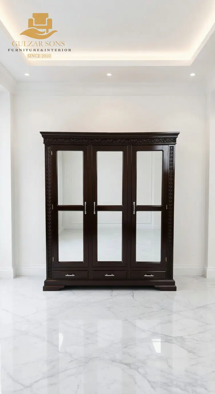 Expertly constructed from the Best Solid Shesham wood Furniture in chiniot 2026, this cabinet is seasoned in our private factories to ensure Export Quality Chinioti Furniture 2026 standards for maximum durability and life-long stability. As a Top Quality Furniture Brand in chiniot 2026, we have applied a rich, high-gloss burled walnut finish accented by architectural fluted pillars. Whether used as a dining room centerpiece or a high-end addition to a Best Jahaiz Package Furniture in Chiniot 2026, this cabinet represents the Best Quality furniture in chiniot 2026. Visit our 3 grand showrooms to witness the superior joinery of Gulzar Sons.