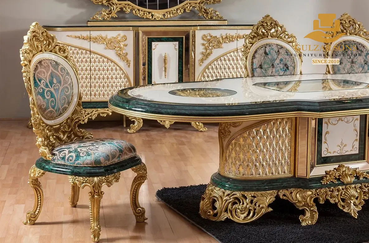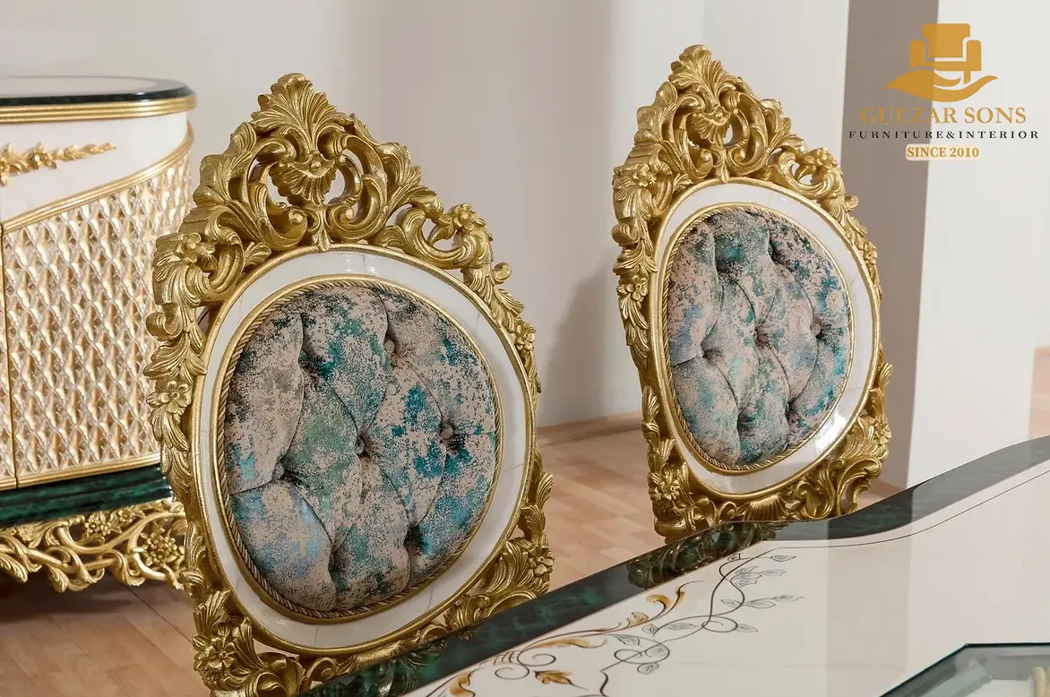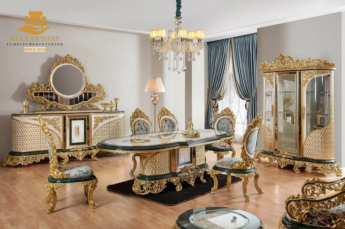 Command your dining hall with the unmatched artistry of the New Latest Furniture Designs 2026. This Rococo Gold Luxury Dining Set is a masterpiece of High Quality Chinioti Furniture 2026, featuring a grand pedestal table and eight master-carved chairs. As a Top Quality Furniture Brand in Chiniot 2026, Gulzar Sons has combined deep emerald-marble effect inlays with flamboyant gold-leaf relief work to create a setting of “Palatial Grandeur”.