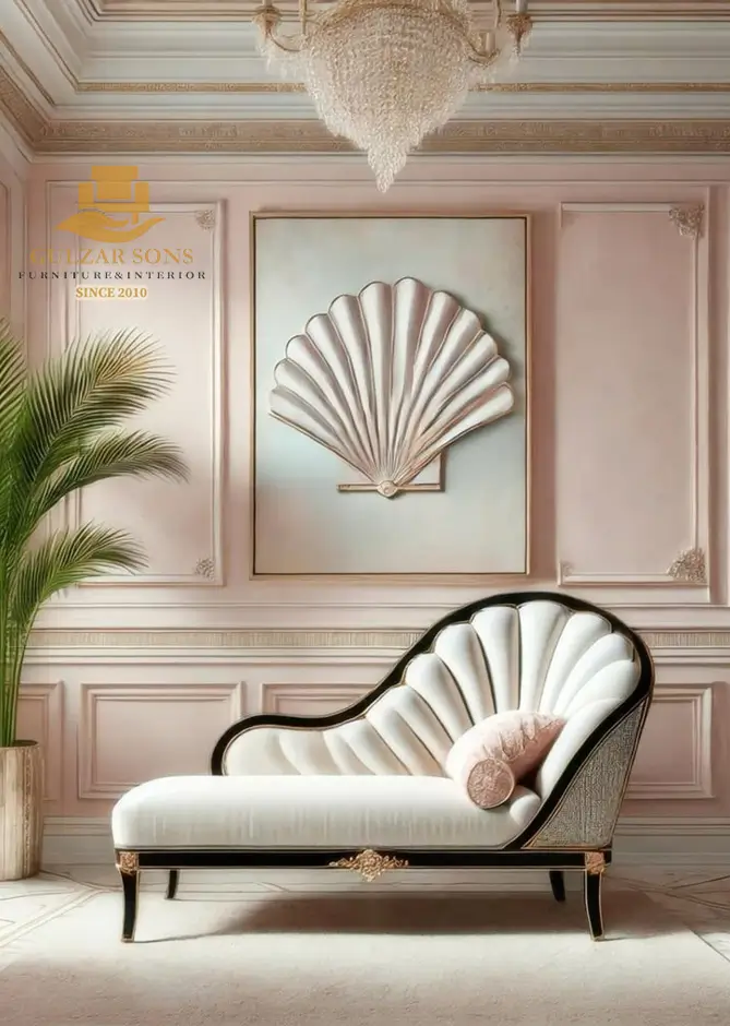 Redefine your interior aesthetic with the New Latest Furniture Designs 2026. This Imperial Scalloped Shell Chaise Lounge (Dewan) is a tour de force of High Quality Chinioti Furniture 2026, featuring a dramatic shell-inspired backrest with deep vertical channel tufting. As a Top Quality Furniture Brand in Chiniot 2026, Gulzar Sons has utilized a striking “Noir & Pearl” palette, combining a deep ebony-lacquered frame with luminous pearl-white velvet to create a setting of “Contemporary Royalty.”