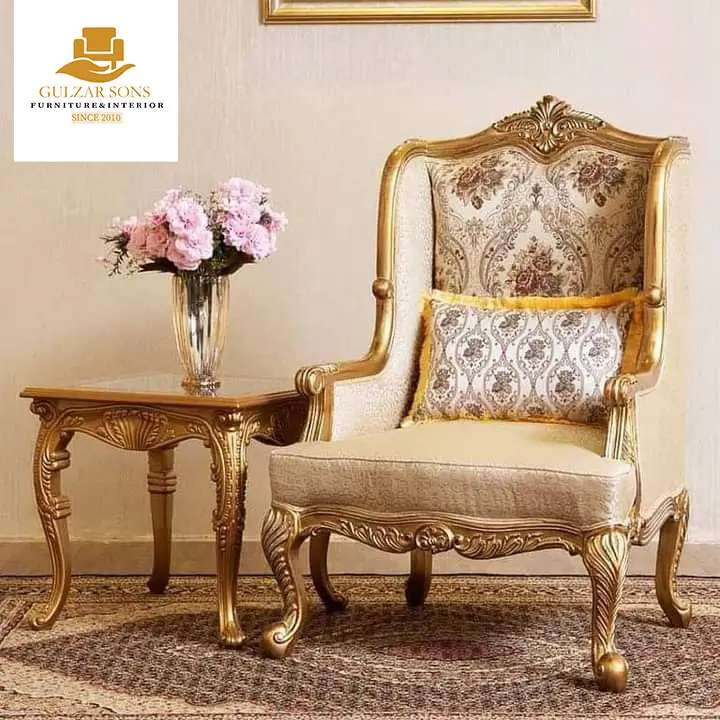 Experience the true meaning of opulence with our New Latest Furniture Designs 2026. This Classic Hand-Carved Bedroom Chair is a masterpiece of High Quality Chinioti Furniture 2026, designed for those who seek the Best Royal Furniture in Chiniot 2026. Featuring a deep-crown hand-carved frame finished in shimmering gold leaf, this chair brings a regal atmosphere to your bedroom or guest lounge.