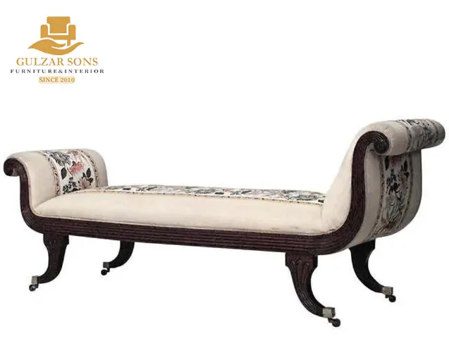 Masterfully hand-constructed from the Best Solid Sheesham wood Furniture in Chiniot 2026, the massive frame is seasoned to meet Export Quality Chinioti Furniture 2026 standards for monumental stability. The Diwan is finished in a unique “Antique Bronze & Gold” patina that highlights the deep-relief acanthus leaf and spiral scroll carvings. Upholstered in premium teal-and-gold striped damask fabric, it includes integrated bolster-style end cushions for a complete royal aesthetic. Whether intended for a central palace lounge or as a heritage addition to a Best Jahaiz Package Furniture in Chiniot 2026, this piece stands as the Premium Quality Furniture in Chiniot 2026.
