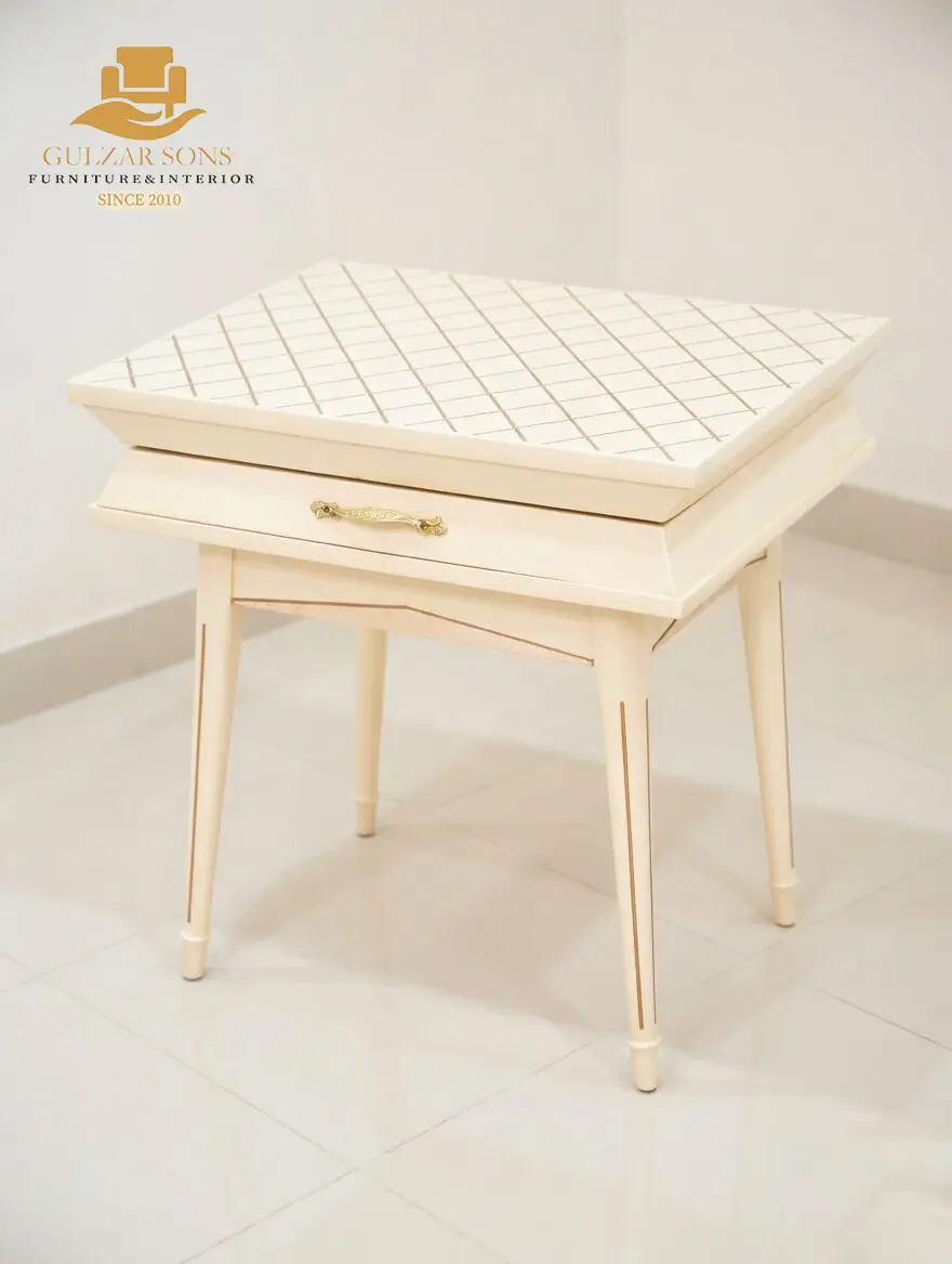 Finish: Elegant white/cream base with hand-rubbed gold accents that define the Best Chinioti Furniture 2026.