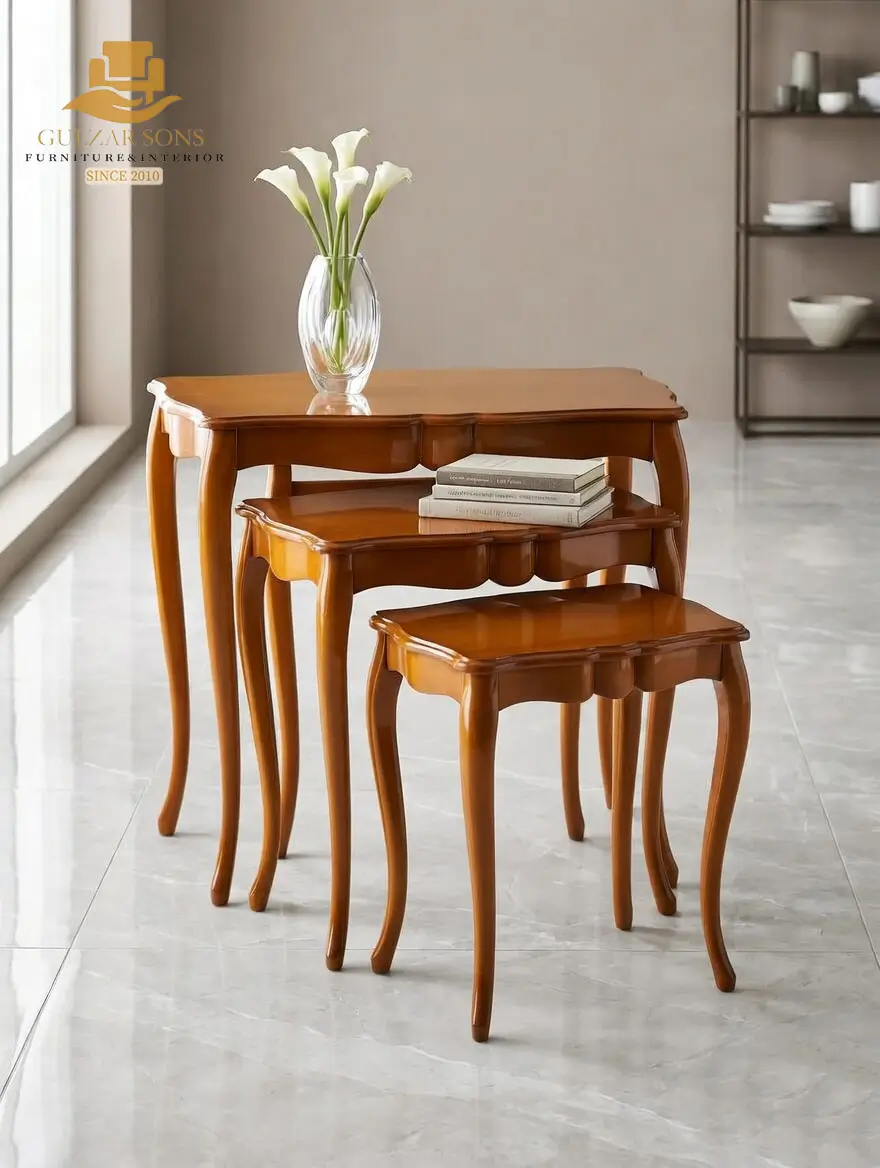 Masterfully hand-constructed from the Best Solid Shesham wood Furniture in Chiniot 2026, each table is seasoned to meet Export Quality Chinioti Furniture 2026 standards for permanent structural integrity. The design features elegant, tapered legs and a rich dual-tone finish that highlights the Best Chinioti Furniture 2026. Whether used as tiered accents for a guest lounge or as a luxury highlight in a Best Jahaiz Package Furniture in Chiniot 2026, these nesting tables stand as the definitive Premium Quality Furniture in Chiniot 2026.