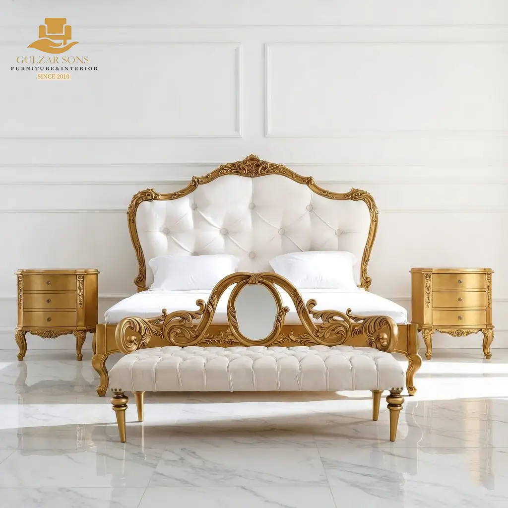 Full Set Includes: King-size bed frame, two matching luxury side tables, and a monumental dresser with a carved mirror and upholstered stool.