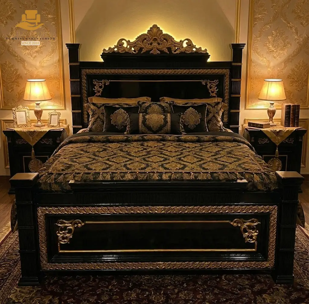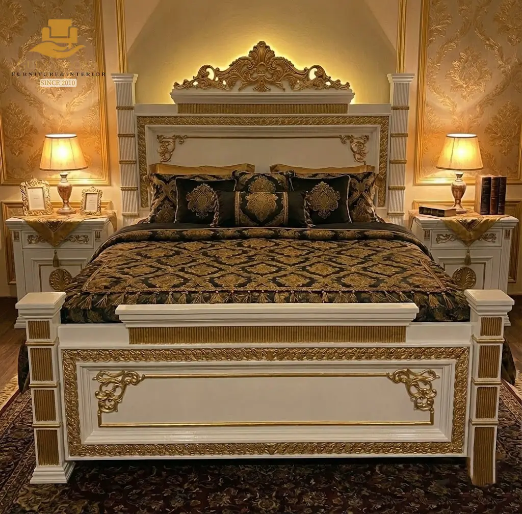 Full Set Includes: King-size bed frame, two matching luxury side tables, and a monumental dresser with a carved mirror and upholstered stool.