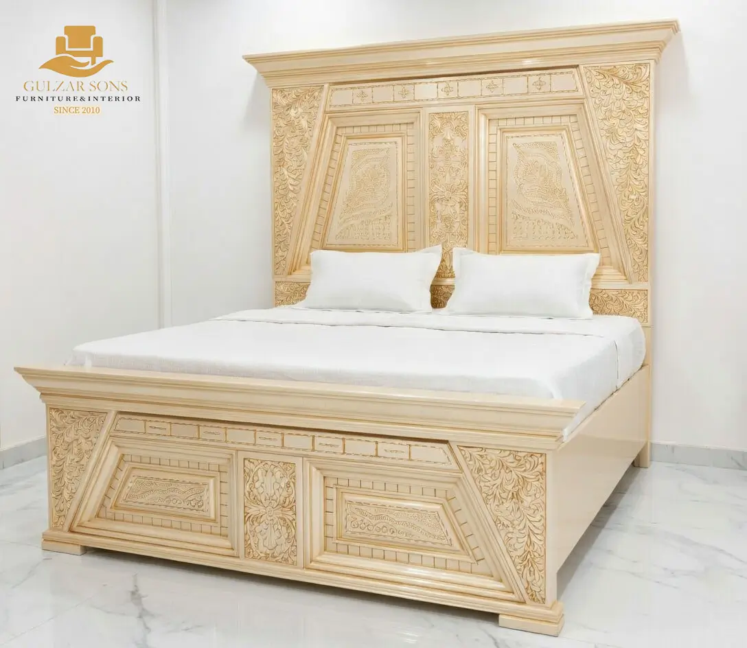 Masterfully hand-constructed from the Best Solid Shesham wood Furniture in chiniot 2026, every inch of the frame is seasoned in our private factories to guarantee Export Quality Chinioti Furniture 2026 standards. As a Top Quality Furniture Brand in chiniot 2026, we have utilized a multi-layered gold-leaf finish with deep mahogany-stained accents to highlight the intricate floral carvings. Whether as the ultimate Best Jahaiz Package Furniture in Chiniot 2026 or a signature piece for a heritage villa, this bed represents the Best Quality furniture in chiniot 2026. Visit our 3 grand showrooms to witness the Victorian majesty of original Gulzar Sons.