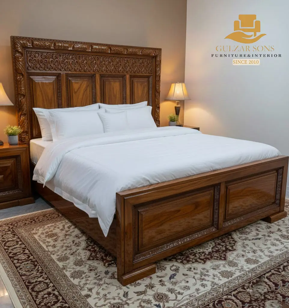 Masterfully hand-constructed from the Best Solid Shesham wood Furniture in chiniot 2026, every inch of the frame is seasoned in our private factories to guarantee Export Quality Chinioti Furniture 2026 standards. As a Top Quality Furniture Brand in chiniot 2026, we have utilized a multi-layered gold-leaf finish with deep mahogany-stained accents to highlight the intricate floral carvings. Whether as the ultimate Best Jahaiz Package Furniture in Chiniot 2026 or a signature piece for a heritage villa, this bed represents the Best Quality furniture in chiniot 2026. Visit our 3 grand showrooms to witness the Victorian majesty of original Gulzar Sons.