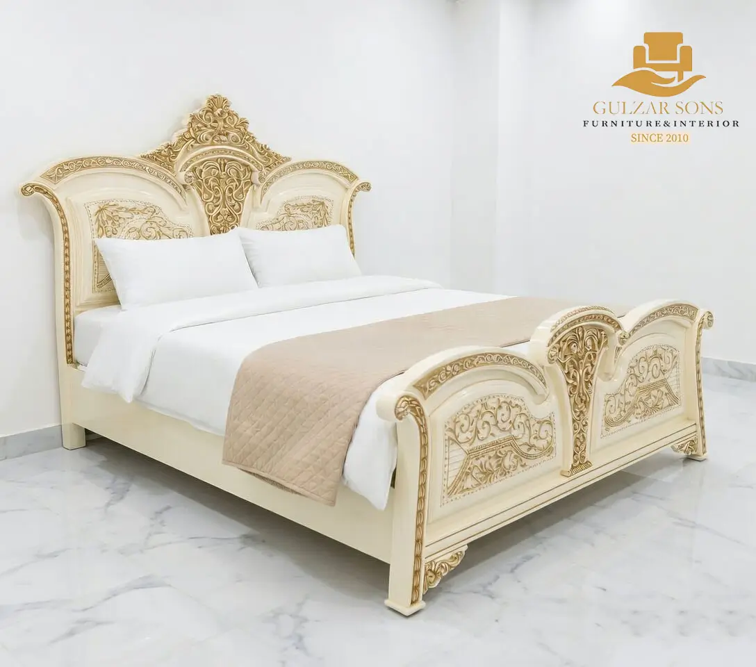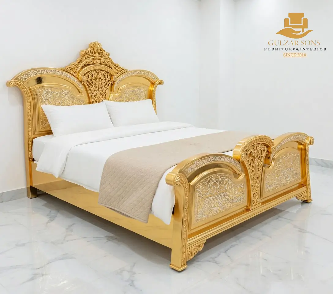 Masterfully hand-constructed from the Best Solid Shesham wood Furniture in chiniot 2026, every inch of the frame is seasoned in our private factories to guarantee Export Quality Chinioti Furniture 2026 standards. As a Top Quality Furniture Brand in chiniot 2026, we have utilized a multi-layered gold-leaf finish with deep mahogany-stained accents to highlight the intricate floral carvings. Whether as the ultimate Best Jahaiz Package Furniture in Chiniot 2026 or a signature piece for a heritage villa, this bed represents the Best Quality furniture in chiniot 2026. Visit our 3 grand showrooms to witness the Victorian majesty of original Gulzar Sons.