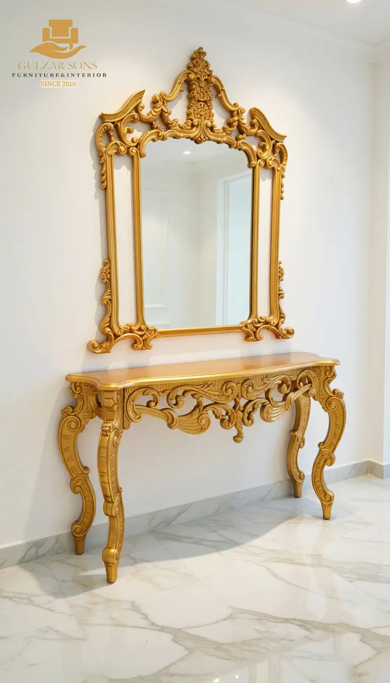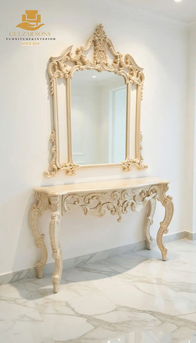 Experience the elegance of European artistry with our New Latest Furniture Designs 2026. This French-Style Rose-Carved Console is a premier example of High Quality Chinioti Furniture 2026, designed for those who appreciate the Best Royal Furniture in Chiniot 2026. Featuring a breathtaking apron adorned with hand-carved rose garlands and finished in a pristine antique white with gold-leaf highlights, this piece establishes Gulzar Sons as a premier luxury brand 2026.