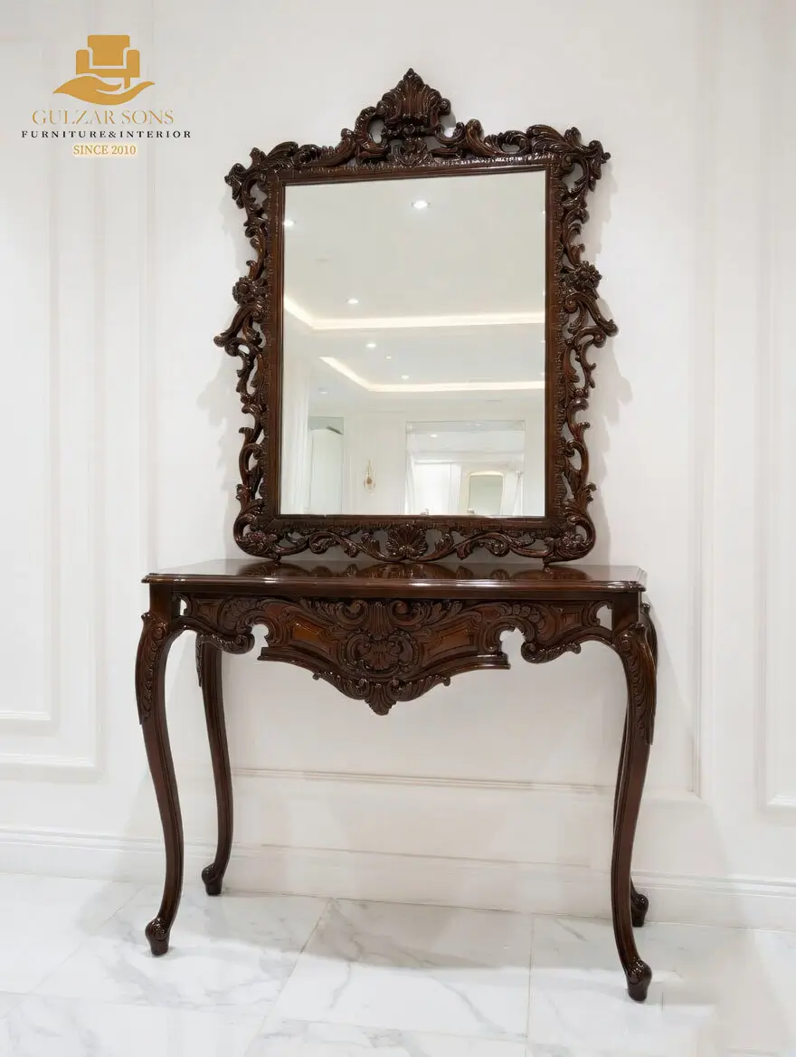 Make a grand first impression with our New Latest Furniture Designs 2026. This Gilded Neo-Classical Console Set is a signature piece of High Quality Chinioti Furniture 2026, designed for homeowners who appreciate the Best Royal Furniture in Chiniot 2026. Featuring a sleek half-moon console with slender fluted legs and a magnificent woven-pattern round mirror, this set is finished in a radiant antique gold that solidifies our status as a premier luxury brand 2026.
