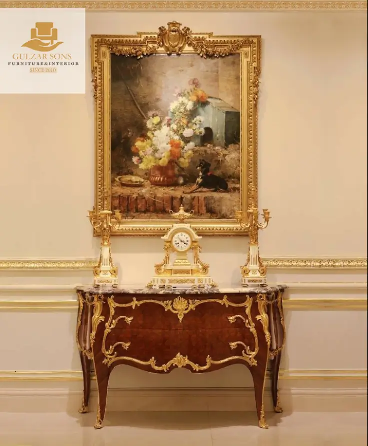 Hardware: Integrated hand-carved wooden motifs finished in gold to maintain a seamless, ornate aesthetic.