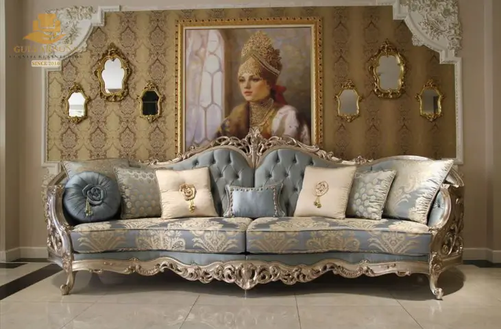 Design: Grand Imperial Baroque style featuring hand-carved acanthus leaf scrollwork and high-arched backrests.