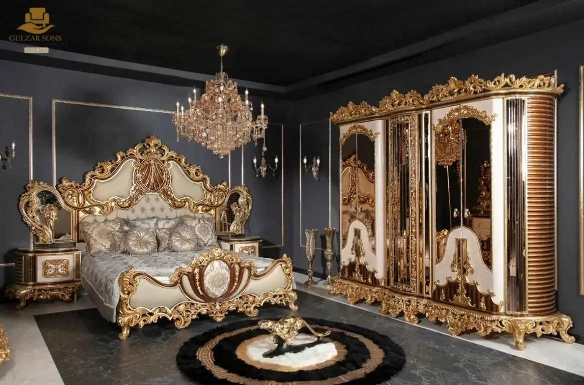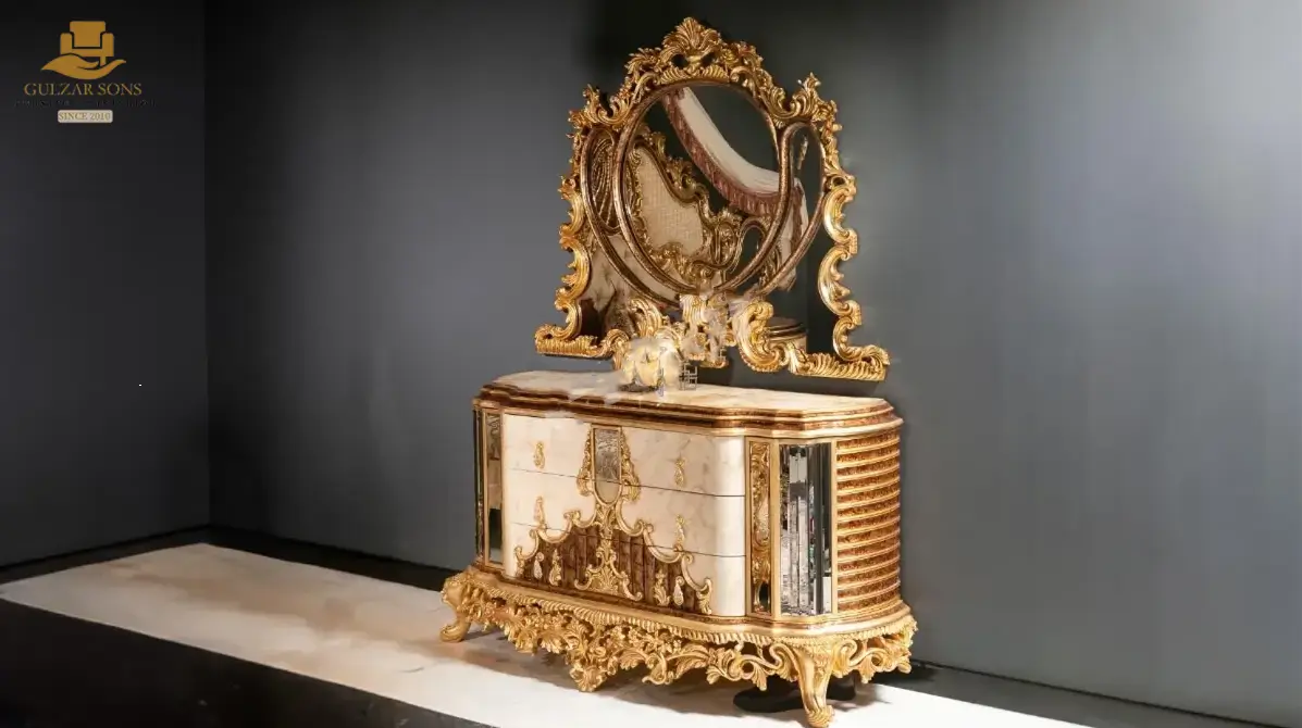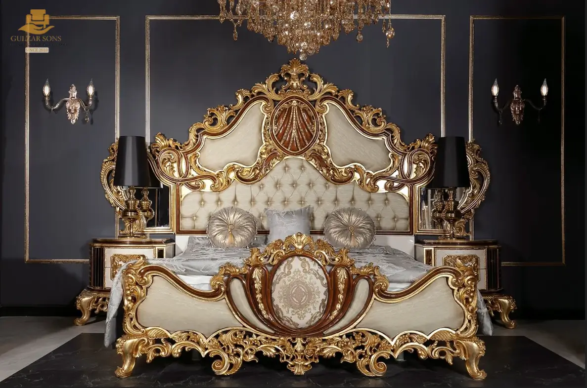 Redefine the concept of “Home Palace” with our New Latest Furniture Designs 2026. This High-End Luxury Ornate Gold Baroque Bed Set is a definitive masterpiece of High Quality Chinioti Furniture 2026, meticulously crafted for elite clients seeking the absolute Best Royal Furniture in Chiniot 2026. Featuring a grand high-profile headboard with an exuberant floral crown and integrated mirrored side panels, this set establishes Gulzar Sons as a premier luxury brand 2026.