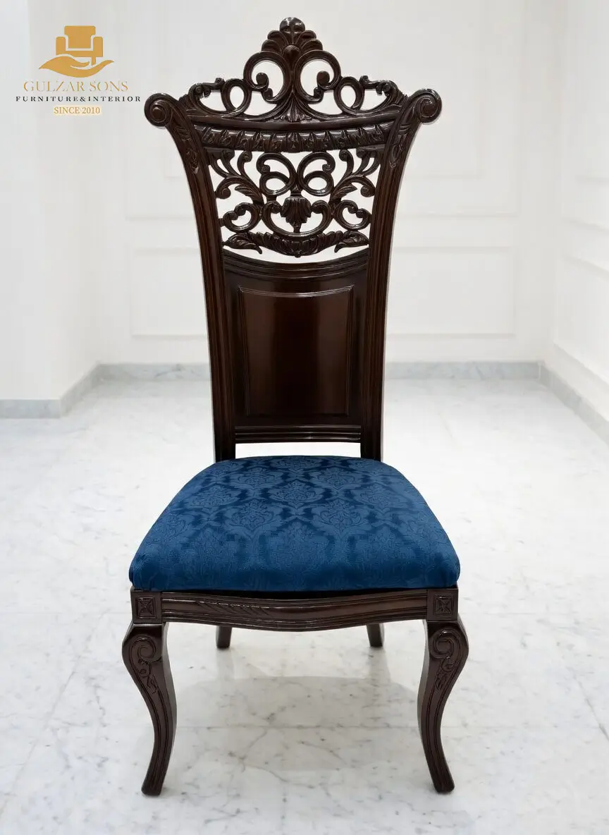 Masterfully hand-constructed from the Best Solid Sheesham wood Furniture in Chiniot 2026, every frame is seasoned in our private factories to guarantee Export Quality Chinioti Furniture 2026 standards. The chairs feature architectural tall-backs with deep-tufted ivory velvet and intricate open-work carving at the base. Whether chosen as the centerpiece of a Best Jahaiz Package Furniture in Chiniot 2026 or for a high-end manor, this set represents the Premium Quality Furniture in Chiniot 2026. Visit our 3 grand showrooms to witness the breathtaking scale of original Gulzar Sons.