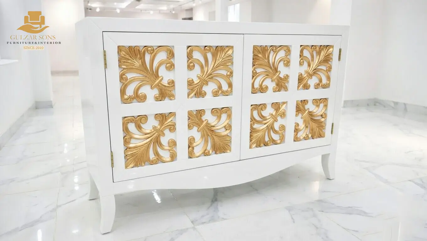 Crafted from the Best Solid Shesham wood Furniture in chiniot 2026, every inch of this chester is seasoned in our private factories to ensure Export Quality Chinioti Furniture 2026. As a Top Quality Furniture Brand in chiniot 2026, Gulzar Sons ensures that the architectural details—from the fluted columns to the ornamental gold carvings—are finished with absolute precision. Whether it serves as a grand foyer centerpiece or a luxury storage unit for a Best Jahaiz Package Furniture in Chiniot 2026, this console set represents the Best Quality furniture in chiniot 2026. Visit our 3 grand showrooms to witness the superior artistry of our latest collection.
