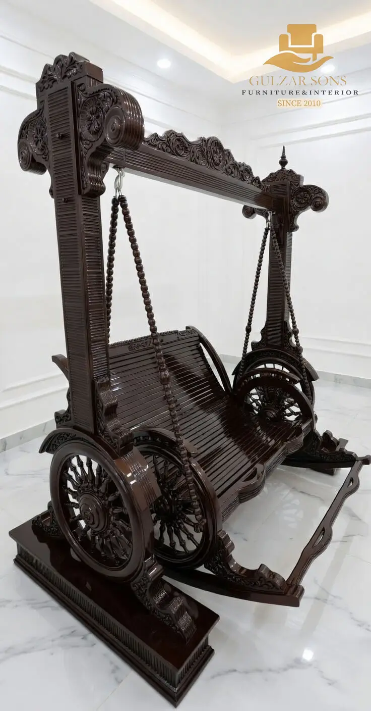 Elevate your home with the timeless grace of the Best Royal Furniture in Chiniot 2026. This masterfully crafted wooden swing (Jhoola) is a hallmark of luxury, designed for those who seek the Best Carving Furniture in Chiniot 2026. Hand-chiseled by expert artisans, it serves as a stunning centerpiece that blends Chinioti heritage with modern-day elegance.