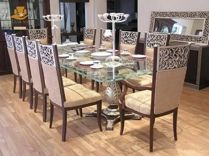 Redefine your banquet hall with the exquisite artistry of the New Latest Furniture Designs 2026. This Neo-Classical Gold Luxury Dining Set is a signature display of High Quality Chinioti Furniture 2026, featuring a grand architectural table and eight high-back “Regal” chairs. As a Top Quality Furniture Brand in Chiniot 2026, Gulzar Sons has masterfully finished this set with radiant 24K gold-leafing and sophisticated mirror-work inlays to create a setting of “Modern Royalty”.