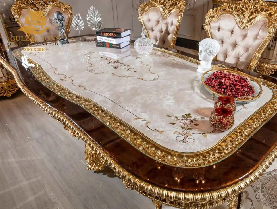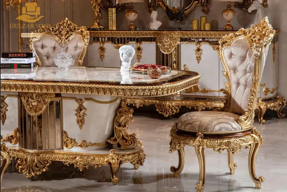 Design: Extreme Baroque-Versailles style featuring a massive double-pedestal table base with integrated mirror-work and “Empress” high-arched chair backs.