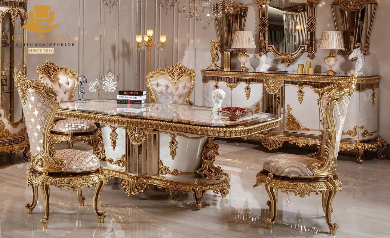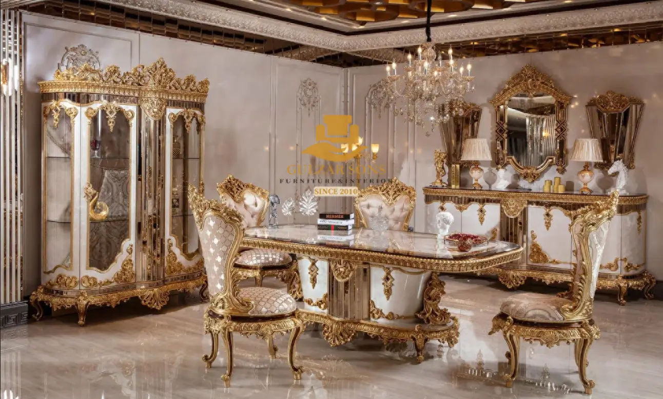 Redefine luxury entertaining with the New Latest Furniture Designs 2026. This Regal Gold Leaf Ivory Dining Set is an exquisite display of High Quality Chinioti Furniture 2026, featuring a grand pedestal table and eight “Empress” high-back chairs. As a Top Quality Furniture Brand in Chiniot 2026, Gulzar Sons has masterfully finished this set in a sophisticated ivory lacquer with flamboyant 24K gold-leaf hand-carving.