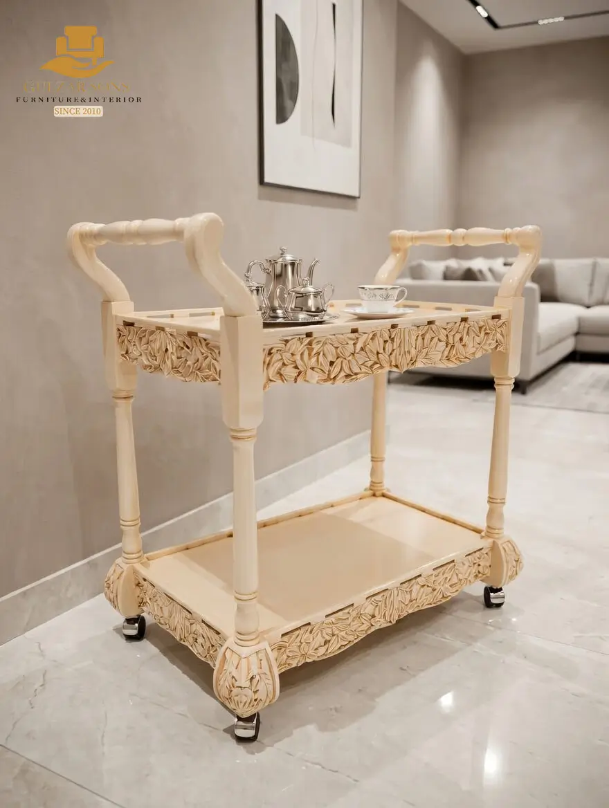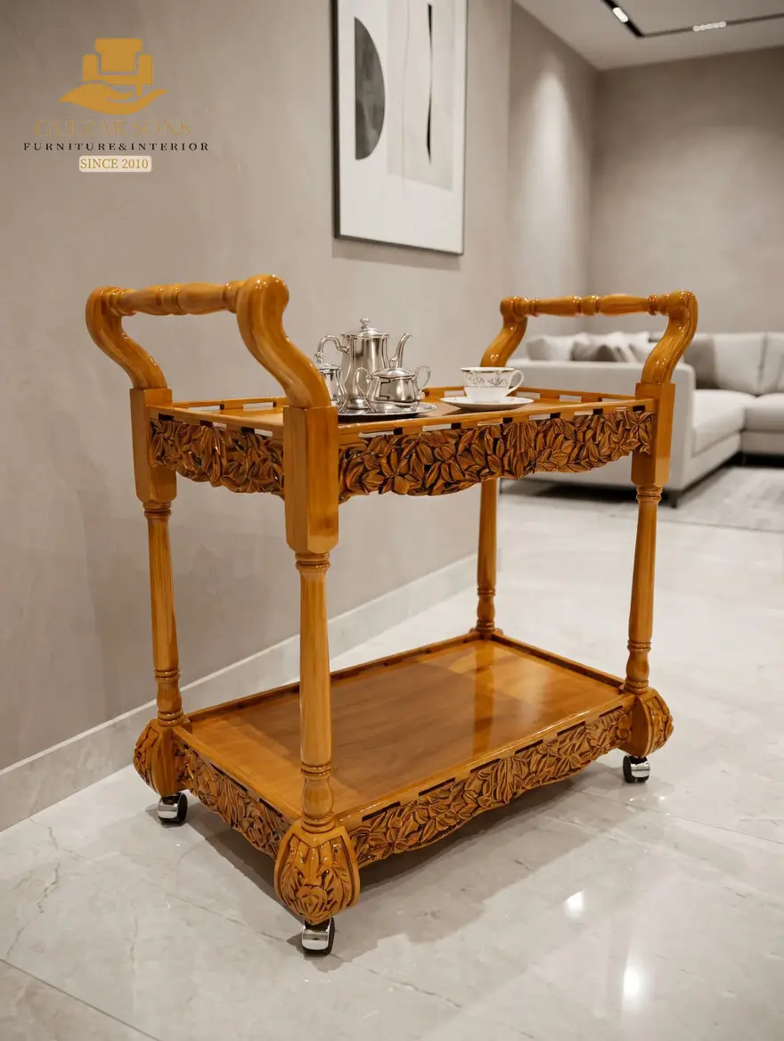 Masterfully hand-constructed from the Best Solid Sheesham wood Furniture in Chiniot 2026, this trolley is seasoned to meet Export Quality Chinioti Furniture 2026 standards for maximum durability and smooth mobility. The design features a textured, patterned top surface for slip resistance and architecturally turned pillars that reflect the Best Carving Furniture in Chiniot 2026. Whether used as a luxury drink station during a grand dinner or as a functional highlight in a Best Jahaiz Package Furniture in Chiniot 2026, this trolley stands as the definitive Premium Quality Furniture in Chiniot 2026.