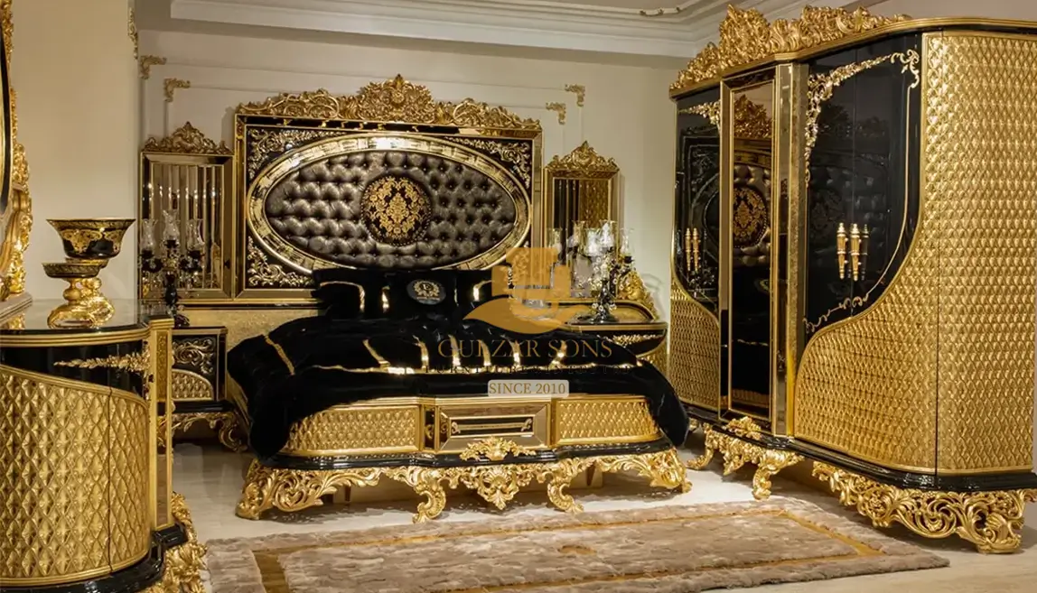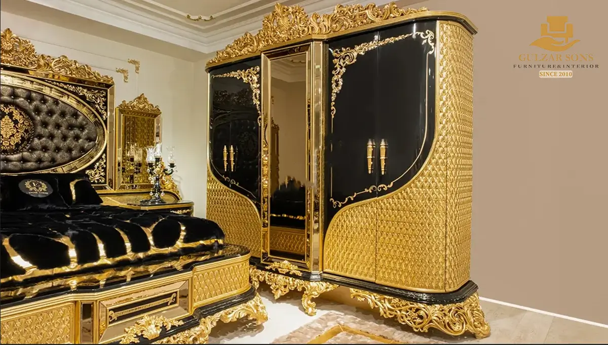 Masterfully hand-constructed from the Best Solid Shesham wood Furniture in chiniot 2026, the entire suite is seasoned in our private factories to guarantee Export Quality Chinioti Furniture 2026 standards for maximum durability. As a Top Quality Furniture Brand in chiniot 2026, we have applied a deep-gloss obsidian lacquer contrasted by heavy 1K gold-leaf gilding across the exuberant Baroque carvings. Whether as the ultimate Best Jahaiz Package Furniture in Chiniot 2026 or a centerpiece for a private villa, this set represents the Best Quality furniture in chiniot 2026. Visit our 3 grand showrooms to experience the unrivaled majesty of original Gulzar Sons.