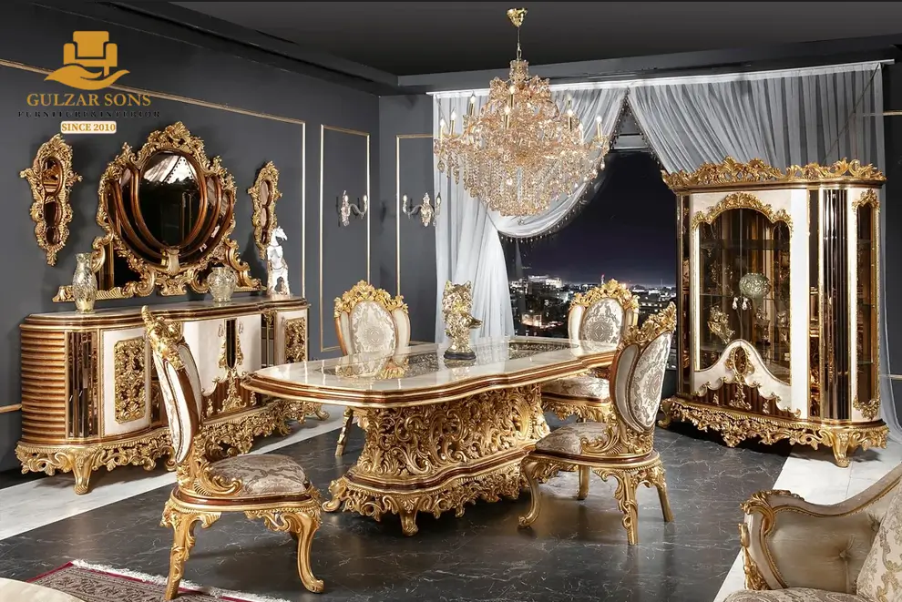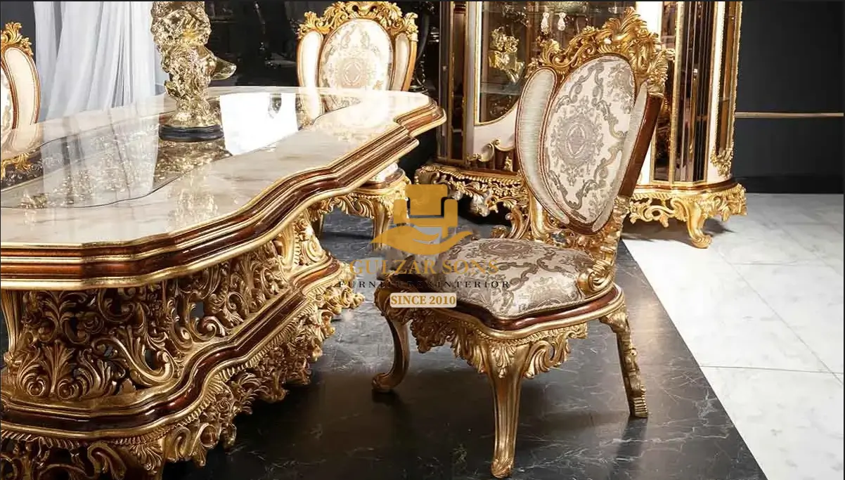 Command your home with the unmatched opulence of the New Latest Furniture Designs 2026. This Imperial Gold Leaf Dining Set is a tour de force of High Quality Chinioti Furniture 2026, featuring a monumental hand-carved pedestal table and eight “Majestic” high-back chairs. As a Top Quality Furniture Brand in Chiniot 2026, Gulzar Sons has utilized a radiant 24K gold-leaf finish to highlight the deep-relief floral carvings that define the Best Royal Furniture in Chiniot 2026.