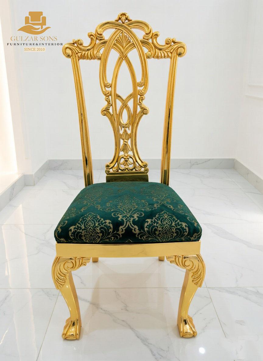Command your home with the unmatched opulence of the New Latest Furniture Designs 2026. This Imperial Gold Leaf Dining Set is a tour de force of High Quality Chinioti Furniture 2026, featuring a monumental hand-carved pedestal table and eight “Majestic” high-back chairs. As a Top Quality Furniture Brand in Chiniot 2026, Gulzar Sons has utilized a radiant 24K gold-leaf finish to highlight the deep-relief floral carvings that define the Best Royal Furniture in Chiniot 2026.