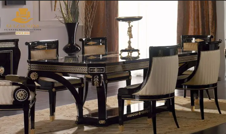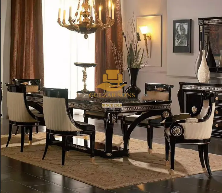 Command your dining space with the bold elegance of the New Latest Furniture Designs 2026. This Imperial Noir & Gold Dining Set is a signature display of High Quality Chinioti Furniture 2026, featuring a high-gloss black lacquer finish accented with intricate gold-leaf fretwork. As a Top Quality Furniture Brand in Chiniot 2026, Gulzar Sons has crafted this set to serve as a symbol of power and refined taste.