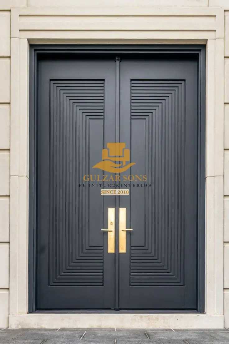 Expertly constructed from the Best Solid Shesham wood Furniture in chiniot 2026, this double door undergoes an intensive seasoning process in our private factories to guarantee Export Quality Chinioti Furniture 2026 standards, ensuring maximum resistance to environmental shifts and warping. As a Top Quality Furniture Brand in chiniot 2026, we have finished this monumental piece in a premium Matte Charcoal lacquer, accented by oversized brushed gold designer pull handles. Whether as a primary villa entrance or a centerpiece for a Best Jahaiz Package Furniture in Chiniot 2026, this door represents the Best Quality furniture in chiniot 2026. Visit our 3 grand showrooms to witness the architectural precision of the original Gulzar Sons.