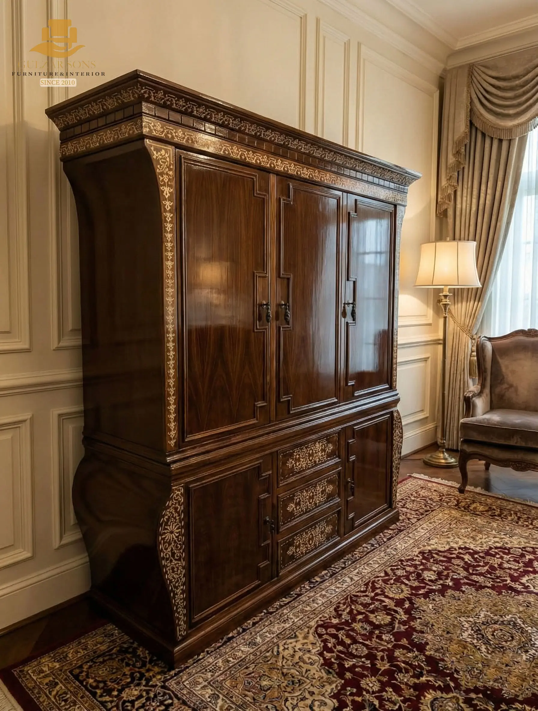 Command the attention of every guest with the New Latest Furniture Designs 2026. This Grand Rococo Gilded Showcase is a monumental example of High Quality Chinioti Furniture 2026, meticulously crafted for those who demand the Best Royal Furniture in Chiniot 2026. Featuring a majestic hand-carved “Crown” crest and a graceful curved “D-shape” silhouette, this piece establishes Gulzar Sons as a premier luxury brand 2026.