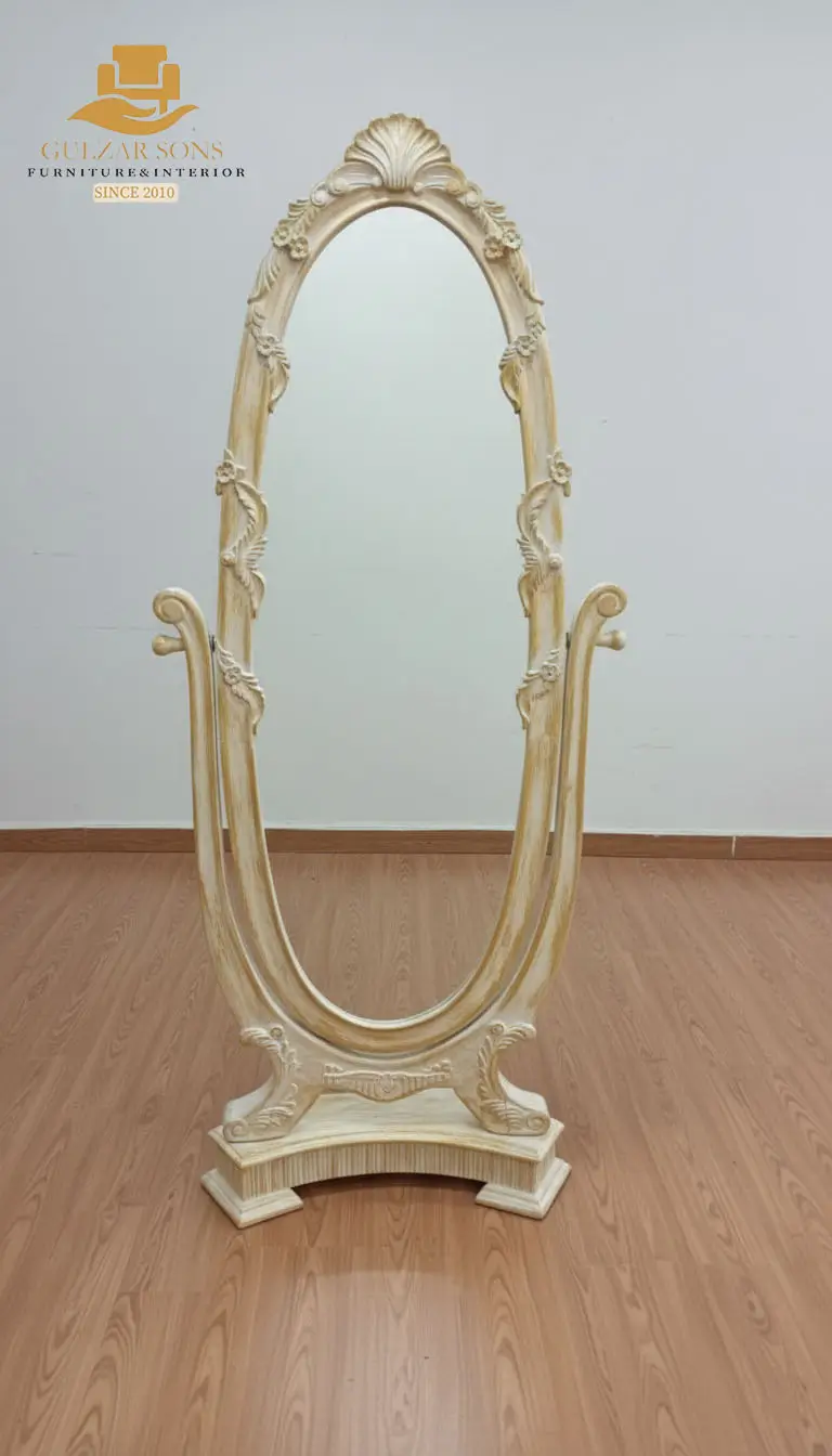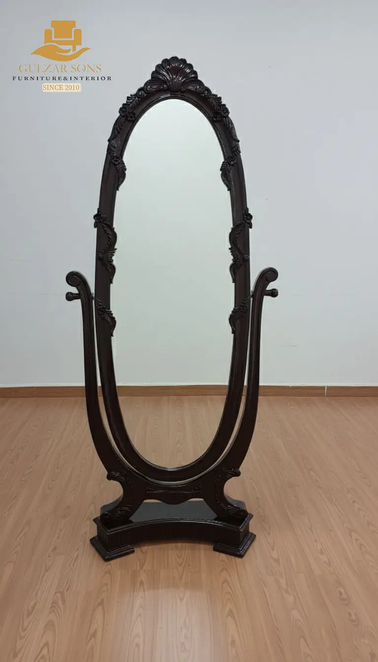 Masterfully hand-constructed from the Best Solid Sheesham wood Furniture in Chiniot 2026, the frame is seasoned to meet Export Quality Chinioti Furniture 2026 standards for lifelong durability. The mirror features ornate hand-carved acanthus leaf details at the crown and base, perfectly balanced by a sturdy architectural stand. Whether used as a functional centerpiece for a master suite or as a premium addition to a Best Jahaiz Package Furniture in Chiniot 2026, this mirror represents the absolute Premium Quality Furniture in Chiniot 2026.