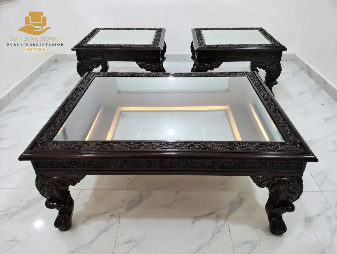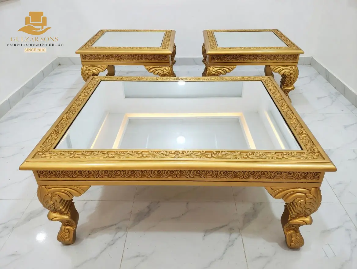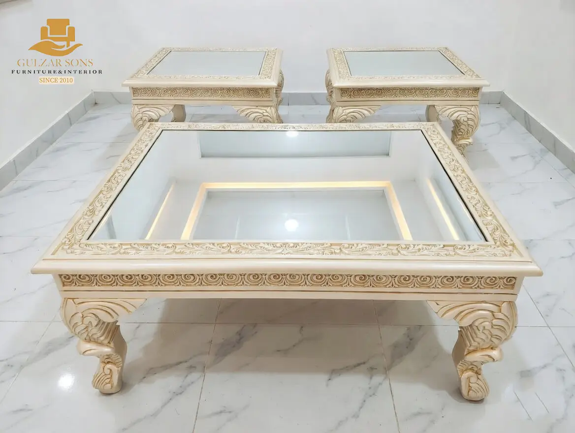 Elevate your living space with the sheer elegance of French imperial design through this center table set from the New Latest Furniture Designs 2026. This set is a masterclass in High Quality Chinioti Furniture 2026, featuring a expansive rectangular coffee table accompanied by matching side tables, all encrusted with high-relief scrollwork and traditional floral flourishes. As a Top Quality Furniture Brand in Chiniot 2026, Gulzar Sons has applied a luminous golden-white duco finish to create a “Crown Jewel for your Lounge” that transcends ordinary decor.