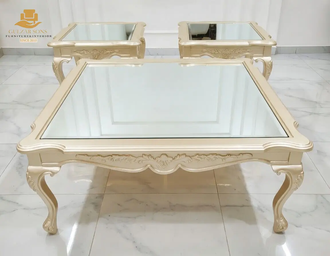 Elevate your living space with the sheer elegance of French imperial design through this center table set from the New Latest Furniture Designs 2026. This set is a masterclass in High Quality Chinioti Furniture 2026, featuring a expansive rectangular coffee table accompanied by matching side tables, all encrusted with high-relief scrollwork and traditional floral flourishes. As a Top Quality Furniture Brand in Chiniot 2026, Gulzar Sons has applied a luminous golden-white duco finish to create a “Crown Jewel for your Lounge” that transcends ordinary decor.