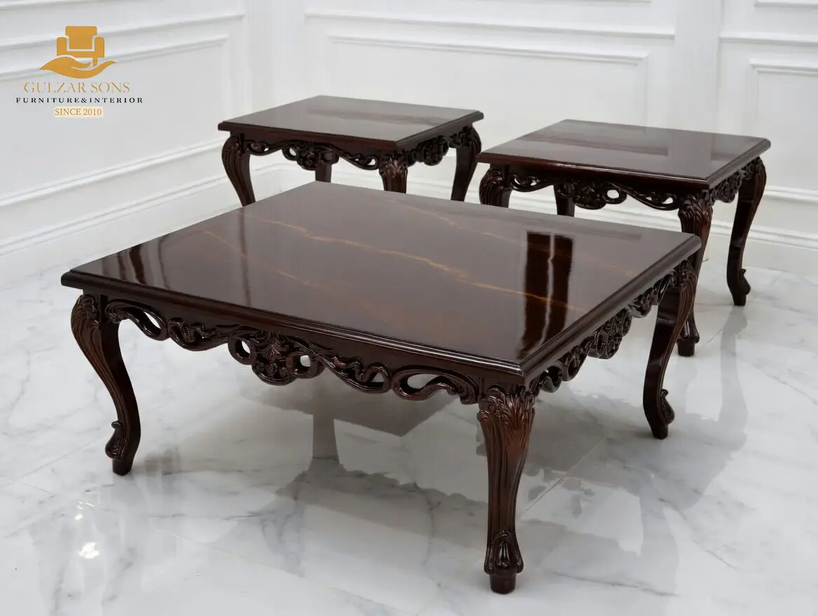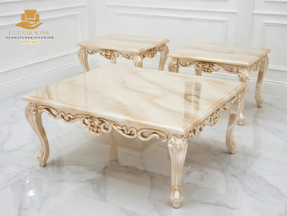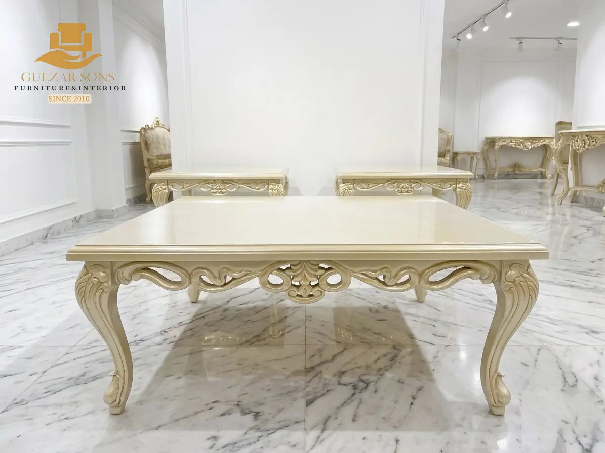 Elevate your living space with the sheer elegance of French imperial design through this center table set from the New Latest Furniture Designs 2026. This set is a masterclass in High Quality Chinioti Furniture 2026, featuring a expansive rectangular coffee table accompanied by matching side tables, all encrusted with high-relief scrollwork and traditional floral flourishes. As a Top Quality Furniture Brand in Chiniot 2026, Gulzar Sons has applied a luminous golden-white duco finish to create a “Crown Jewel for your Lounge” that transcends ordinary decor.