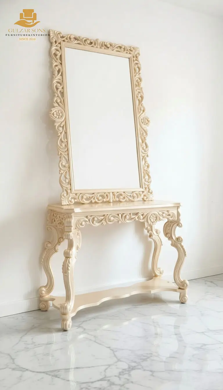 Handcrafted from the Best Solid Shesham wood Furniture in chiniot 2026, this set represents our commitment as a premier luxury brand 2026 to durability and heritage. As a Top Quality Furniture Brand in chiniot 2026, Gulzar Sons utilizes advanced wood-seasoning in our private factories to ensure a flawless, long-lasting finish that meets Export Quality Chinioti Furniture 2026 standards. Whether as a standalone heritage piece or the crowning jewel of a Best Jahaiz Package Furniture in Chiniot 2026, this console offers the Best Quality furniture in chiniot 2026. Visit our 3 grand showrooms to experience the refined beauty of our Victorian collection.